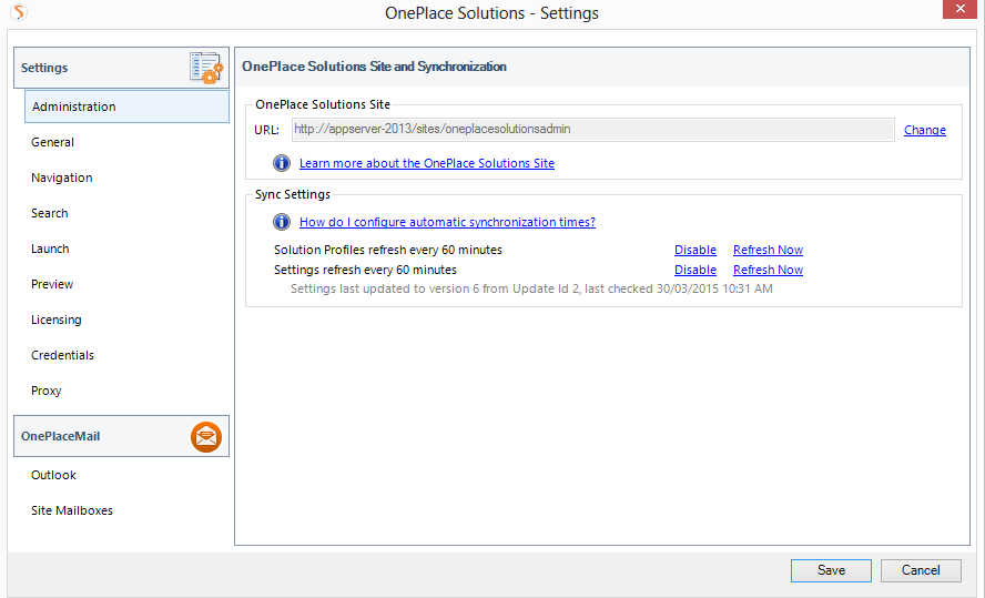 The administration tab allows you to set the OnePlace Solutions site and synchronization settings to refresh profiles and configuration settings.