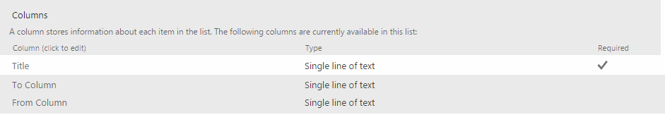 <?xml version="1.0" encoding="UTF-8"?> <configuration> <columnMapping action="delete"/> <columnMapping action="insert" useColumnMappingUrl="true" listUrl="http://portal86/sites/sitecol2/lists/columnmappinglist" enabled="true"/> </configuration>
