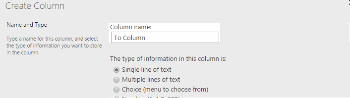 10. Specify the column name as To Column. It is important to use the exact column name and case, make sure To starts with a capital T and Column with capital C.