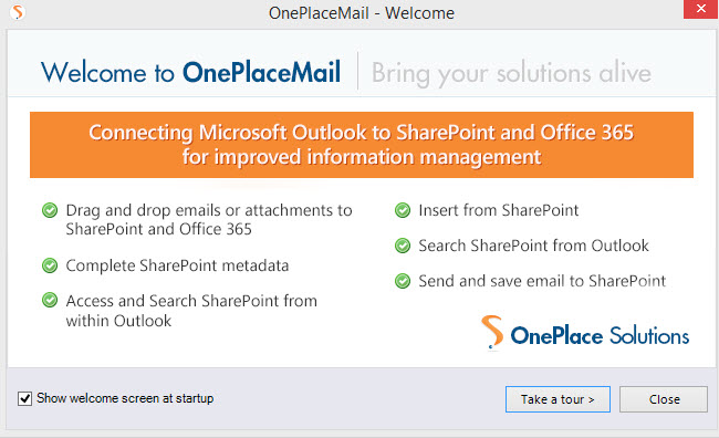 A welcome screen dialog is displayed when a user launches Outlook for the first time after installation. This dialog presents a series of information on how to use OnePlaceMail.