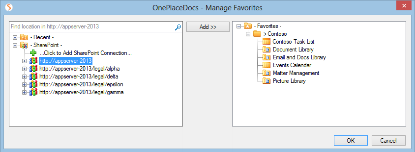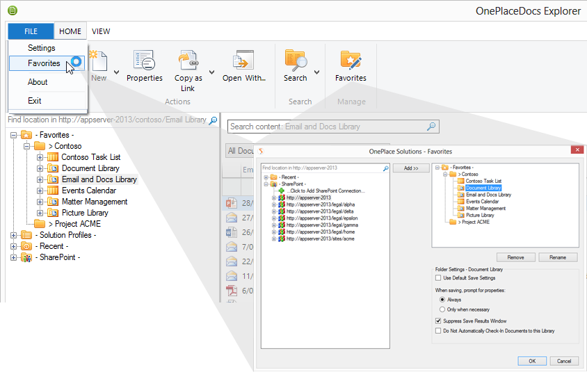 Favorite locations are personal shortcuts to SharePoint / Office 365 locations. They can be managed from either OnePlaceMail or OnePlaceDocs and are shared across both solutions. Favorite locations can include SharePoint Site Collections, Sites, Libraries, Lists, Folders or Document Sets and the locations can be from different SharePoint environments.