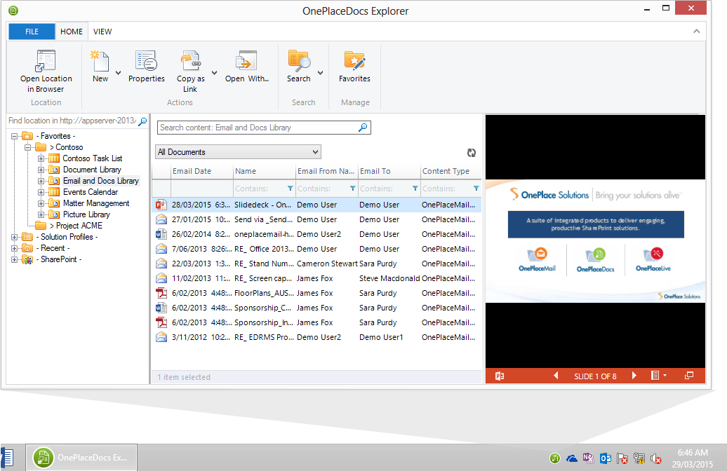 The Docs Explorer for SharePoint/Office 365 provides easy access and navigation of your most important SharePoint/Office 365 locations and content. As a windows task tray application, it is always available and can be called upon to conveniently and efficiently help you engage with SharePoint.