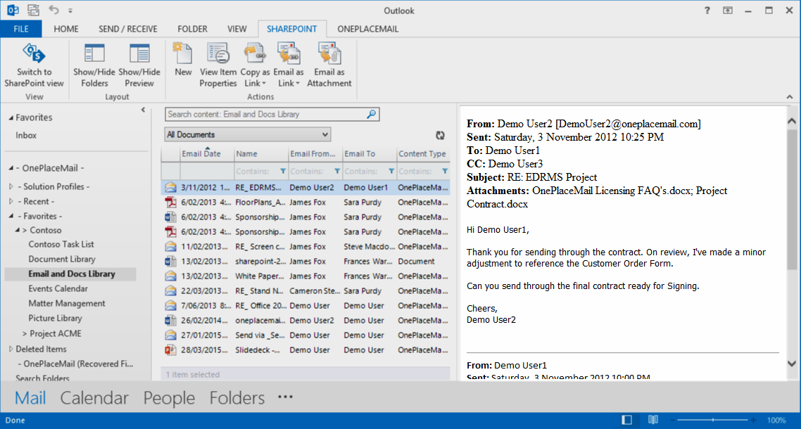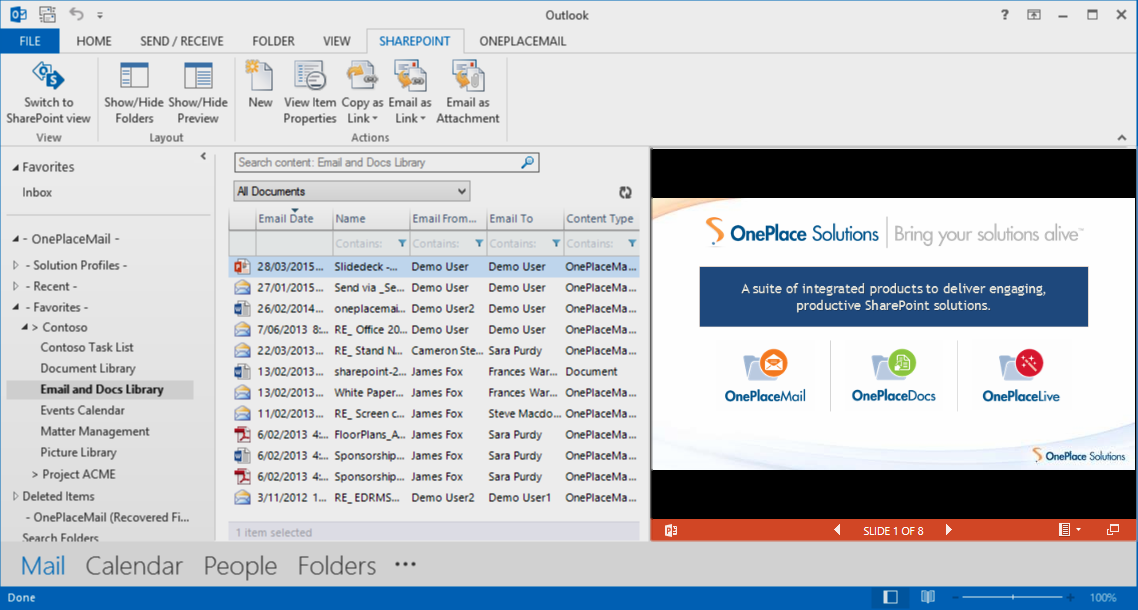OnePlaceMail delivers Email and Document Previews within the Outlook style experience. Where available, OnePlaceMail uses the Office Web Application Server preview capabilities provided by SharePoint / Office 365 environments.