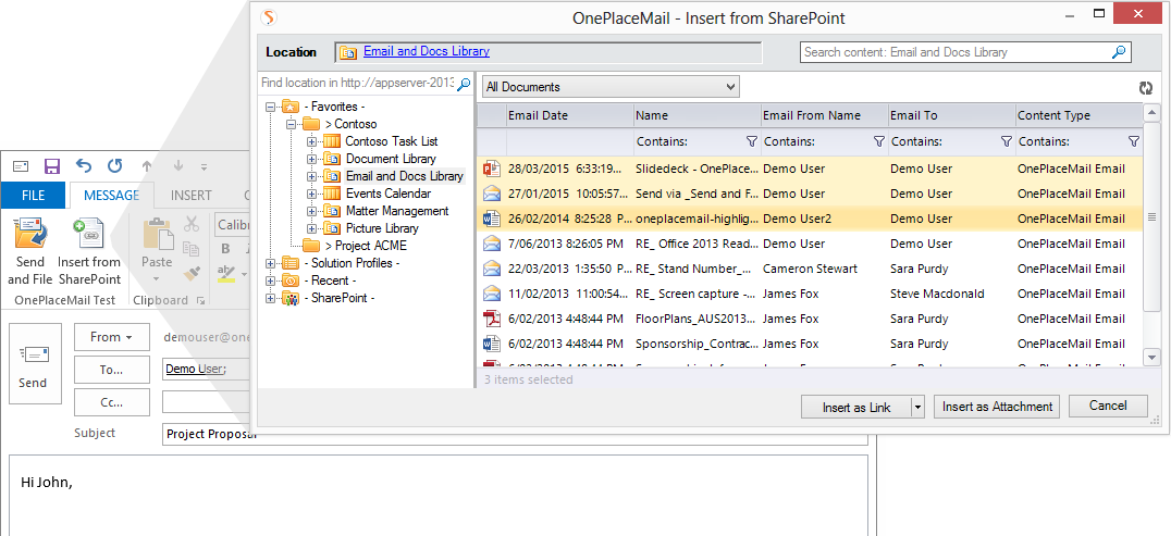 - From a draft/reply email message, select ‘Insert from SharePoint’