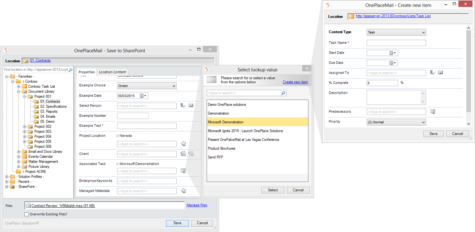 Lookup Columns in SharePoint/Office 365 are made available in the Save to SharePoint window. A value can be selected by using the type-ahead capabilities (similar to the Managed Metadata) or by using the selection window.