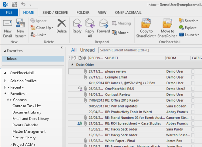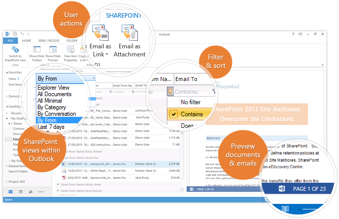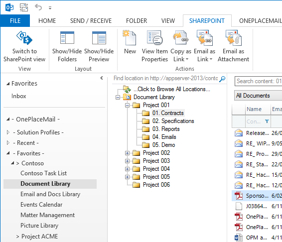 OnePlaceMail provides an Outlook style experience for navigating SharePoint / Office 365 locations. For the selected location, you can toggle between the Outlook style interface and the SharePoint web browser interface while staying in Microsoft Outlook.
