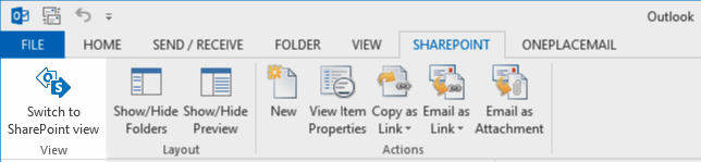 To show the Outlook style experience for SharePoint, select a OnePlaceMail folder (favorite, recent or solution profile location) on the left navigation of Outlook. The folders represent locations in SharePoint/Office 365 such as a: library, list, folder, document set or site.