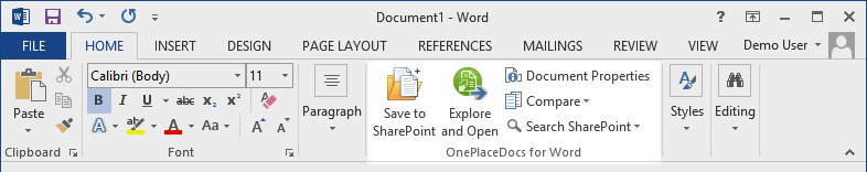 Microsoft Word - OnePlaceDocs ribbon group (Excel and PowerPoint contain a similar ribbon group)