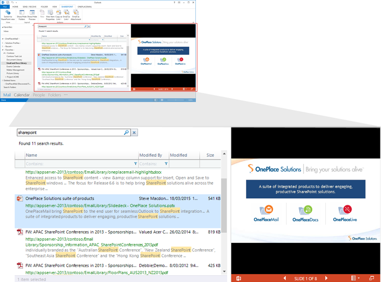 OnePlaceMail delivers the power of SharePoint search within the Microsoft