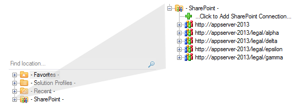 The SharePoint node presents the connections made to your SharePoint / Office 365 environments.