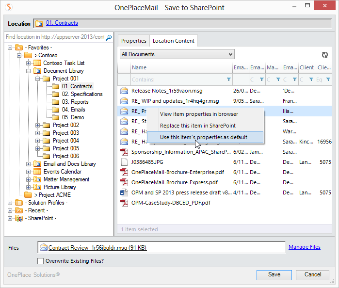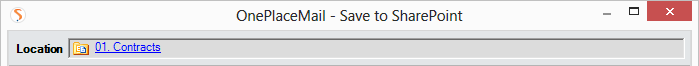 The Save to SharePoint window is shared by OnePlaceMail and OnePlaceDocs, delivering a consistent user experience when saving content to SharePoint / Office 365.
