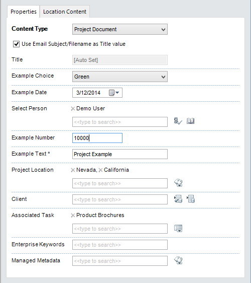 SharePoint / Office 365 columns are available for completion. Default values are presented and required columns specified in SharePoint / Office 365 will be enforced.