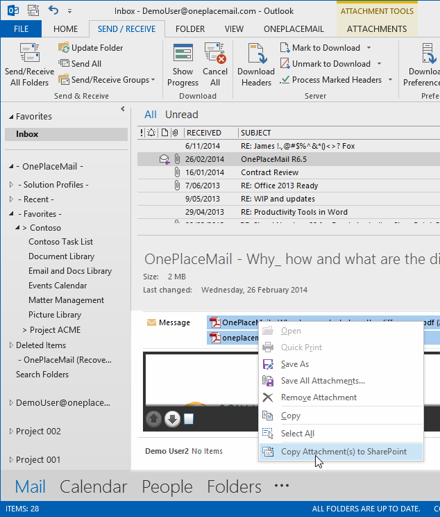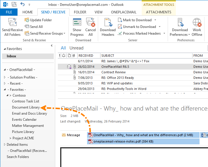 Select one or more email attachments from the email preview pane and drag/drop to a OnePlaceMail location on the left navigation of Outlook. The can be a Favorite, Recent or a location within a Solution Profile. The drag/drop process will always perform a copy (leaving the attachments within the originating email message).