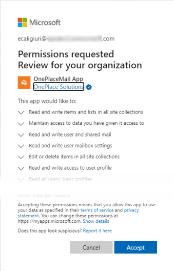 OnePlace Solutions App uses 'Delegated' mode for all permissions required.