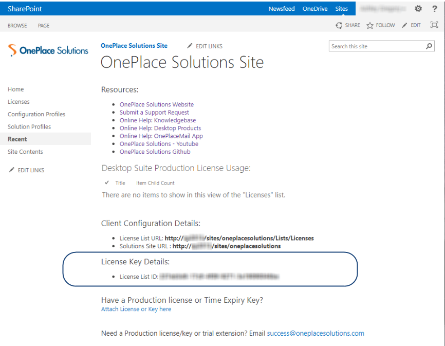 For environments with no Microsoft 365 accounts, (SP 2010, 2013, 2016 or 2019), the OnePlace Solutions Desktop suite is licensed a license list in your OnePlace Solutions Administration site.