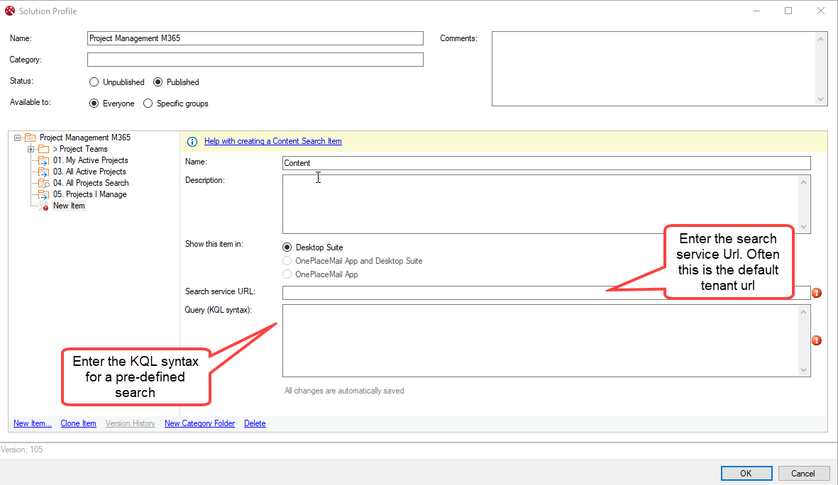 The Search (content item) provides the ability to define a search query (KQL) to return one or more items of content from across your SharePoint/Office 365 environment. Content may include documents indexed by SharePoint / Office 365.