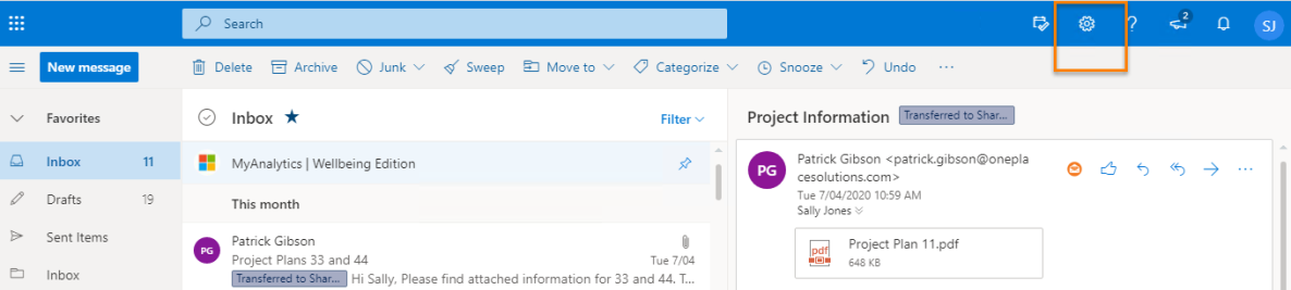 - In Outlook for the Web select the gear icon in the top right hand corner