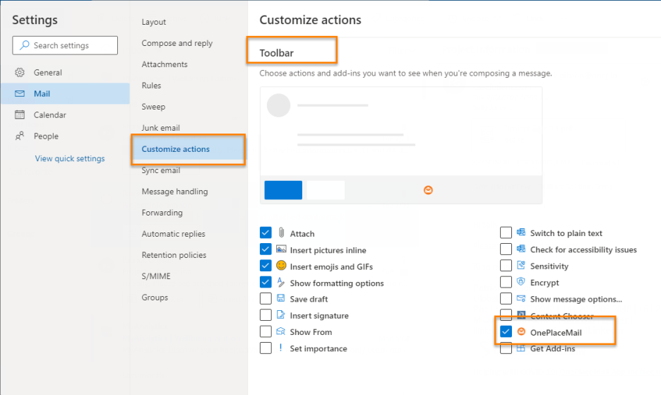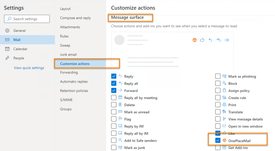 Select Customize actions, under 'Message Surface' > select the OnePlaceMail