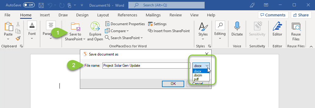 When a new document has been created in the Microsoft Office suite, the document can be saved to SharePoint and metadata captured without leaving the application you are working in.