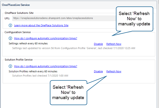 By default, OnePlaceMail & OnePlaceDocs will check for any configuration or OnePlaceLive changes every 60 minutes. To check immediately, select 'Refresh Now ' for each respective service.