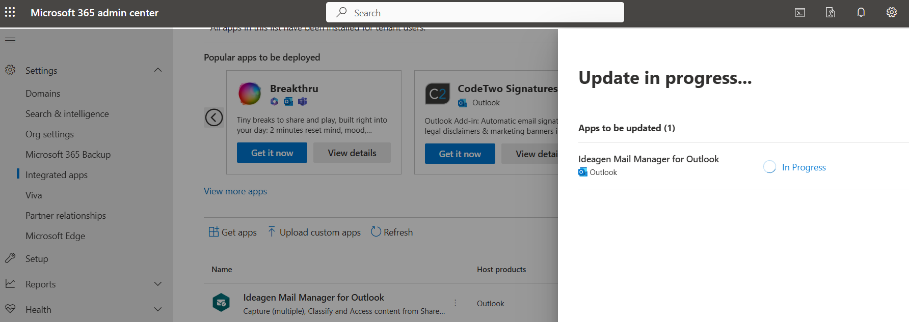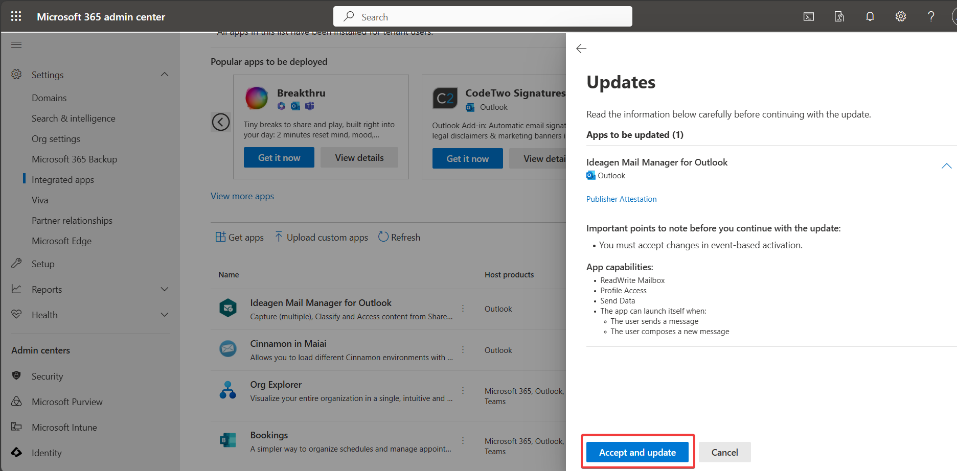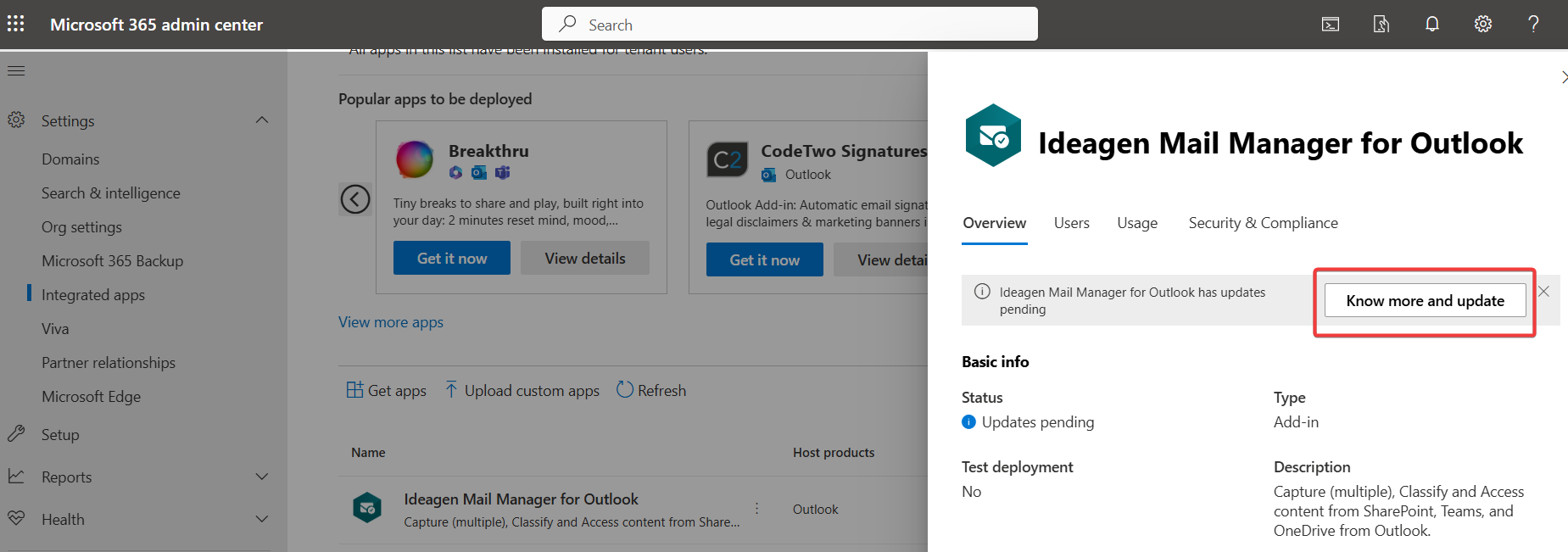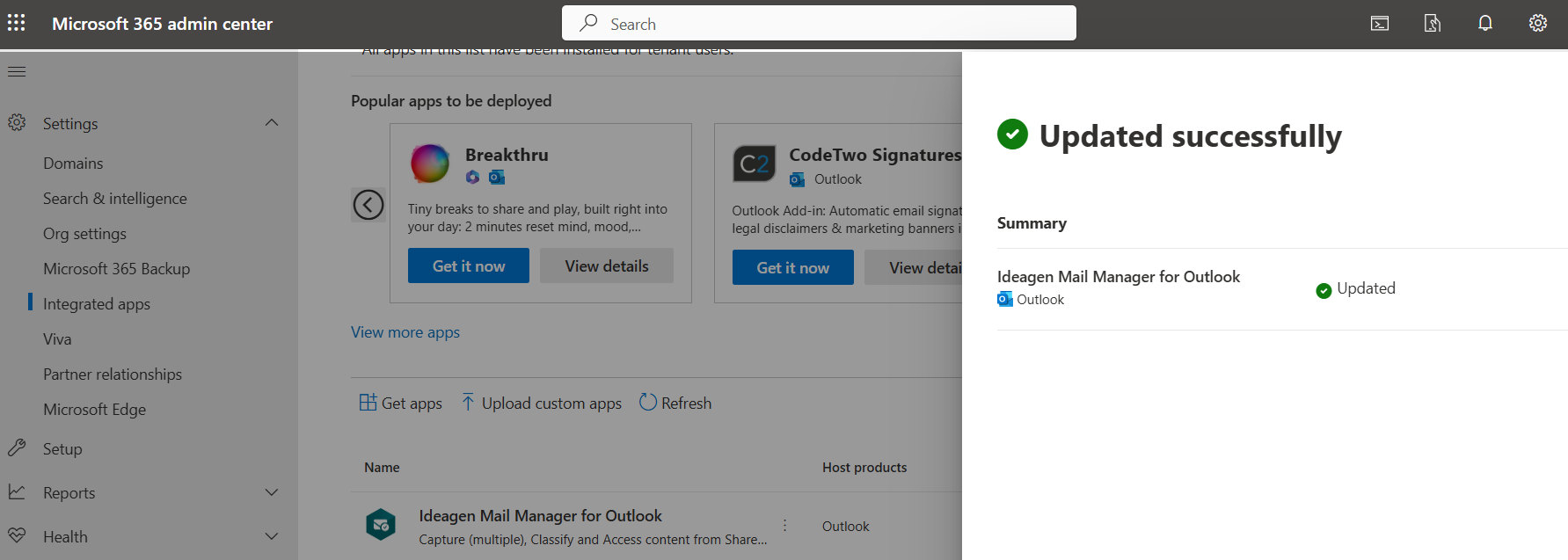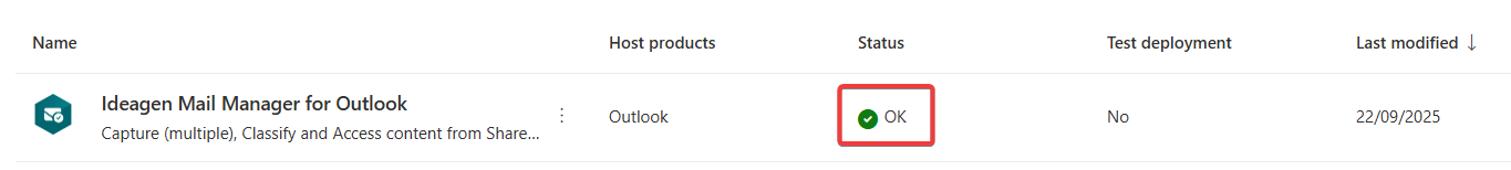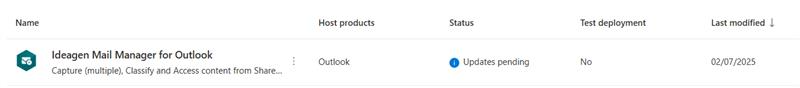 There has been an important upgrade to the OnePlaceMail App (modern web add-in) - now Ideagen Mail Manager that requires your immediate attention. If the OnePlaceMail App has been centrally admin-deployed prior to September 17th, 2025, a Microsoft 365 Azure administrator is required to complete an update to the OnePlaceMail App in the Admin Center.