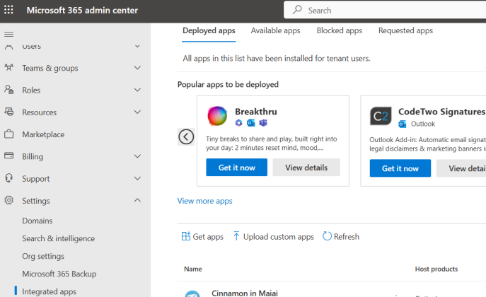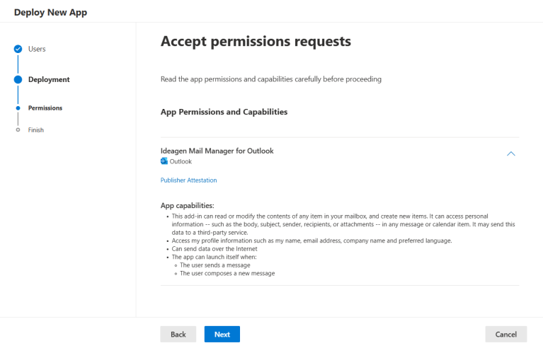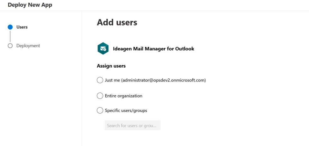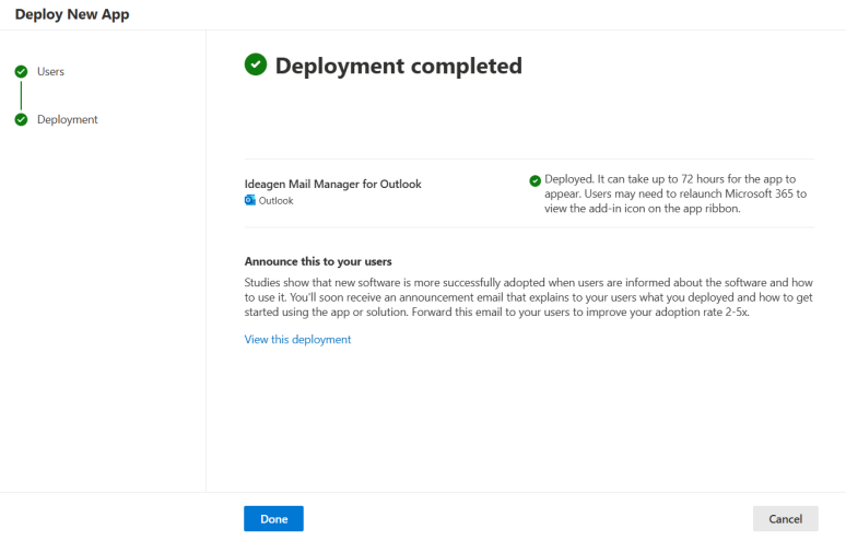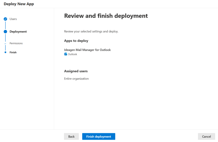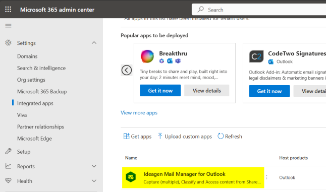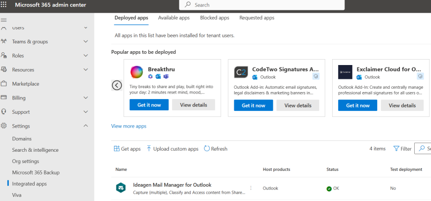 The Ideagen Mail Manager Enterprise app can be deployed centrally via the Microsoft Admin Center.