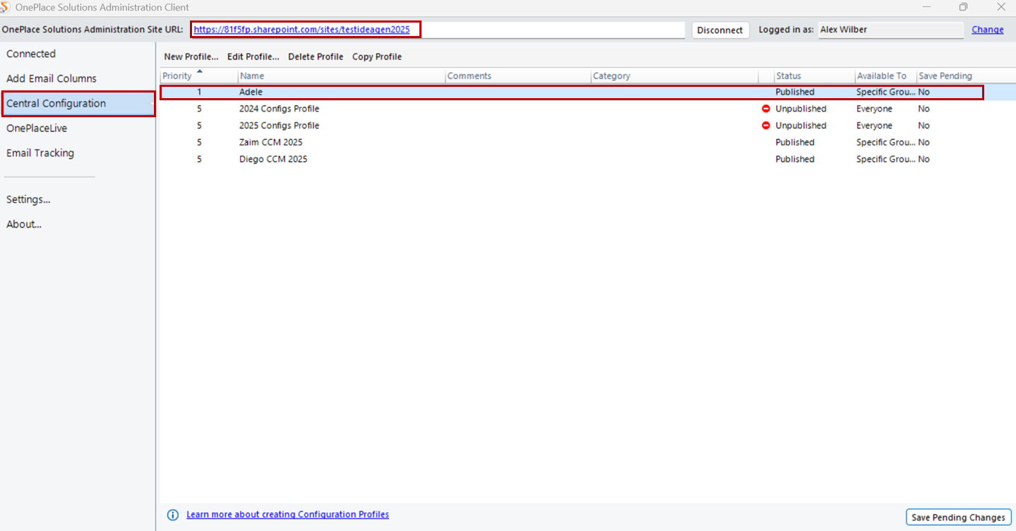 An administrator can then navigate to the ‘Central Configuration’ section within the admin client display and select the Configuration profile (by double clicking on the profile name) for which they want to specify 1 or more content types as the default Content Type when saving an email via OnePlaceMail.