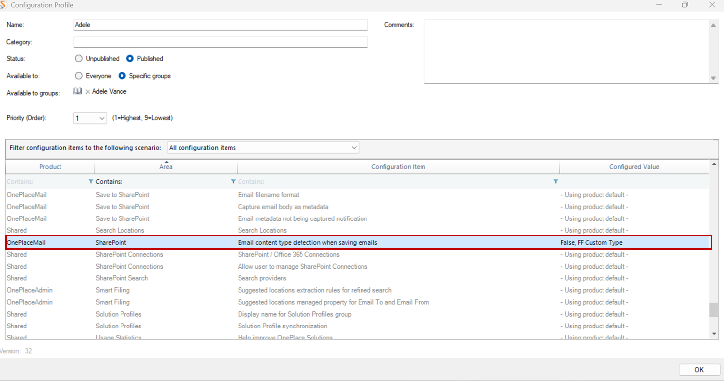 Once the Configuration Profile of the selected profile opens, double click to select the ‘Email content type detection when saving emails’ configuration item in the configuration items table.